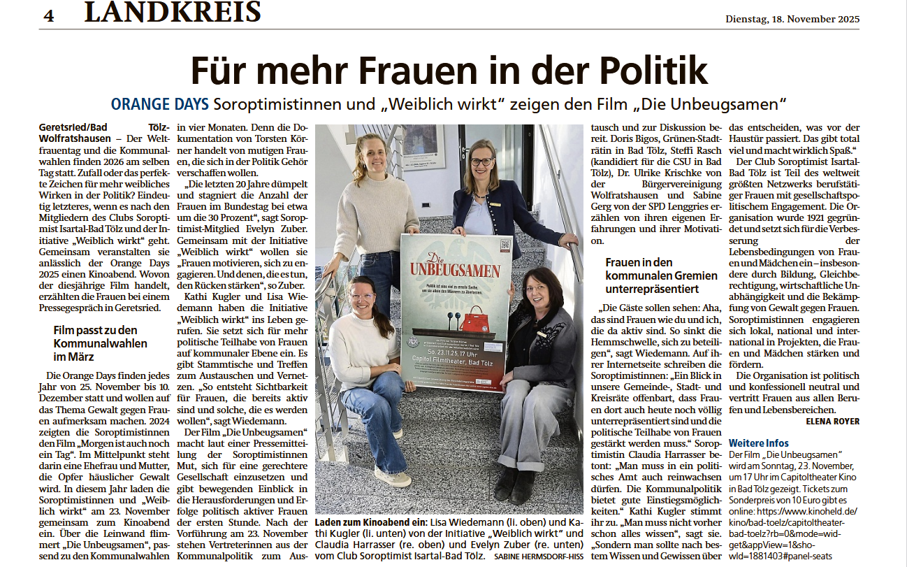 Vier starke Frauen aus dem Landkreis machen dieser Tage besonders auf ein wichtiges globales Thema aufmerksam - sich explizit gegen Gewalt an Frauen und Mädchen zu positionieren. Gestern starteten die von der UN ins Leben gerufenen ORANGE DAYS, eine jährlich stattfindene weltweite Intitiative für Prävention und Hilfen, die mit dem Internationalen Tag der Menschenrechte am 10.Dezember endet.
